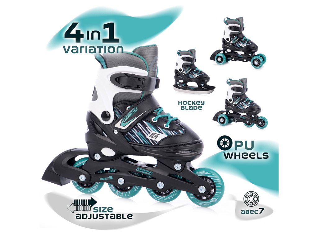 Jedna bota umožňuje snadnou přestavbu mezi variantami – lední brusle, inline uspořádání, stabilizační 2+2 systém a quad podvozek. Začátečník ocení větší stabilitu, pokročilejší jezdec klasické inline uspořádání pro plynulejší a rychlejší jízdu. Přestavba probíhá pomocí osiček a distančních prvků, které jsou součástí balení. Velkou výhodou je nastavitelná velikost, která se upravuje jednoduchým mechanismem pod patou. Rozsah několika velikostí umožňuje, aby brusle rostly spolu s dítětem.