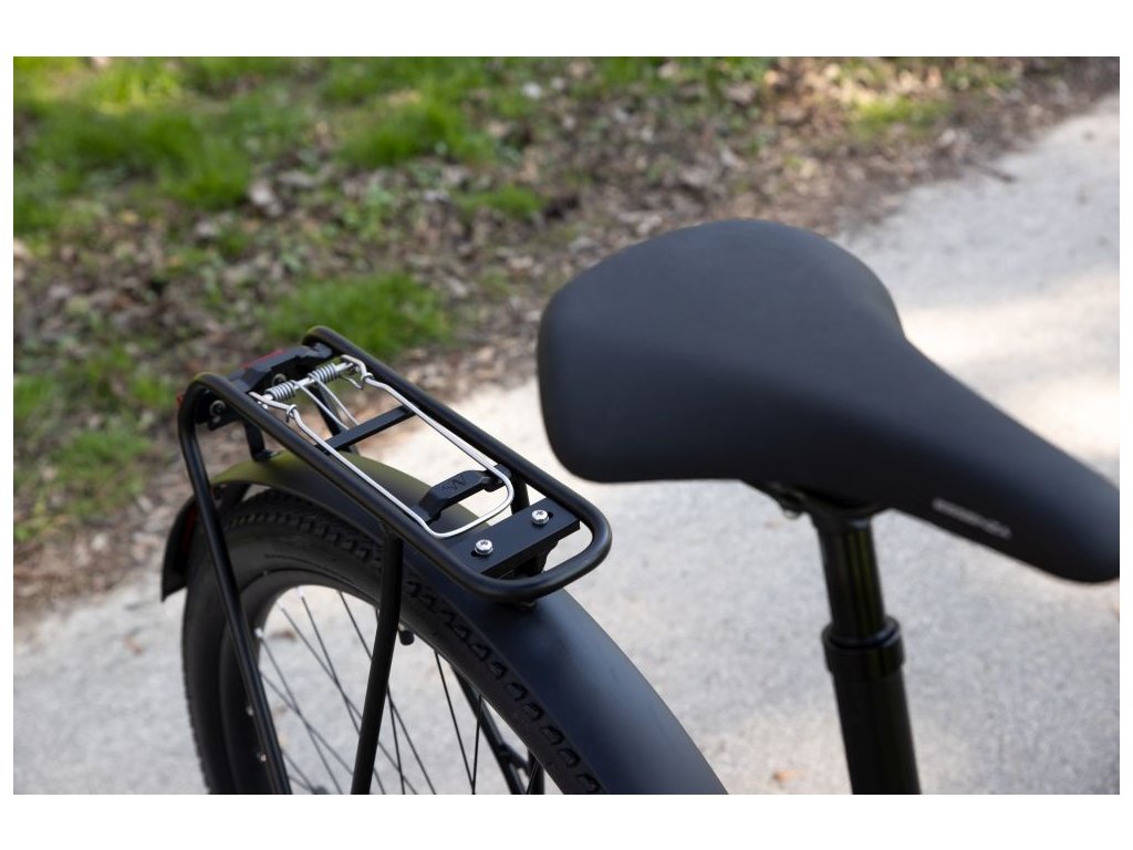 Brzdění je zajištěno hydraulickými brzdami Shimano MT200 s 180mm kotouči. Kolo je vybaveno plnými blatníky, stojanem Atran Velo Rex a nosičem Delta Carrier s nosností až 27 kg. Komfort zvyšují ploché pedály z nylonu vyztuženého skleněnými vlákny a odpružená sedlovka.